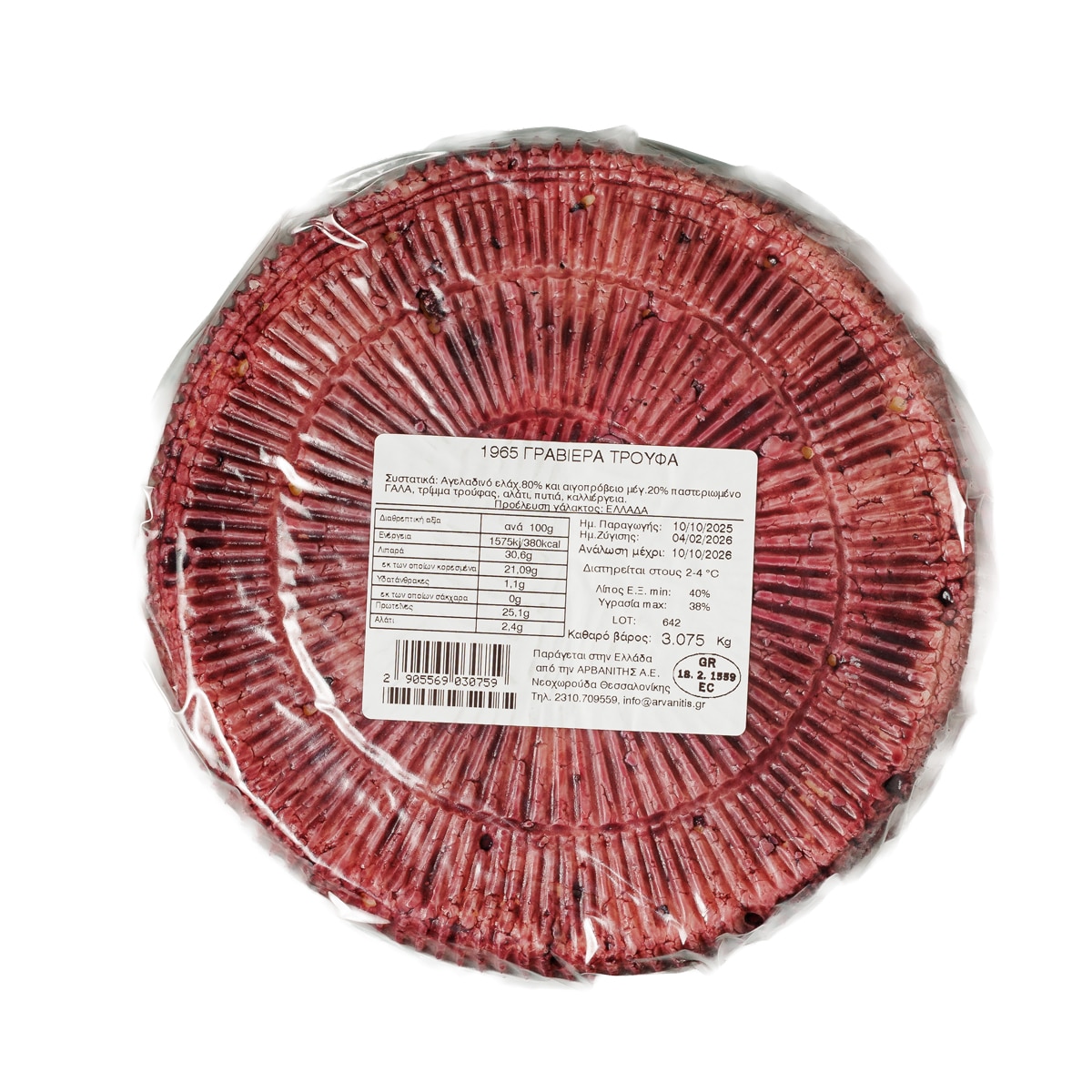 1965 Graviera Truffle is a premium take on the classic graviera, enriched with black truffle crumble that lends the cheese a deep, earthy aroma and a refined, sensorial character