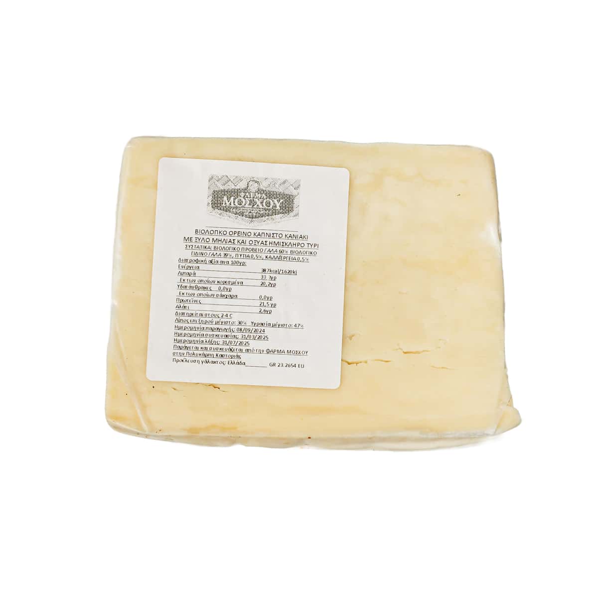 Το Καπνιστό Κανιάκι είναι μια αποκλειστική πατέντα της καθετοποιημένης Φάρμας Μόσχου — βιολογικό ημίσκληρο τυρί από αιγοπρόβειο γάλα, καπνισμένο σε ξύλα μηλιάς και οξυάς.